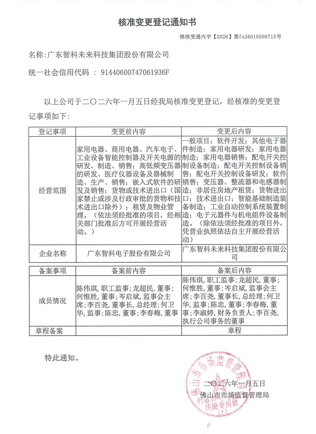 經(jīng)市場監(jiān)督管理部門核準(zhǔn),自2026年1月5日起,原“廣東智科電子股份有限公司”正式更名為“廣東智科未來科技集團股份有限公司”。